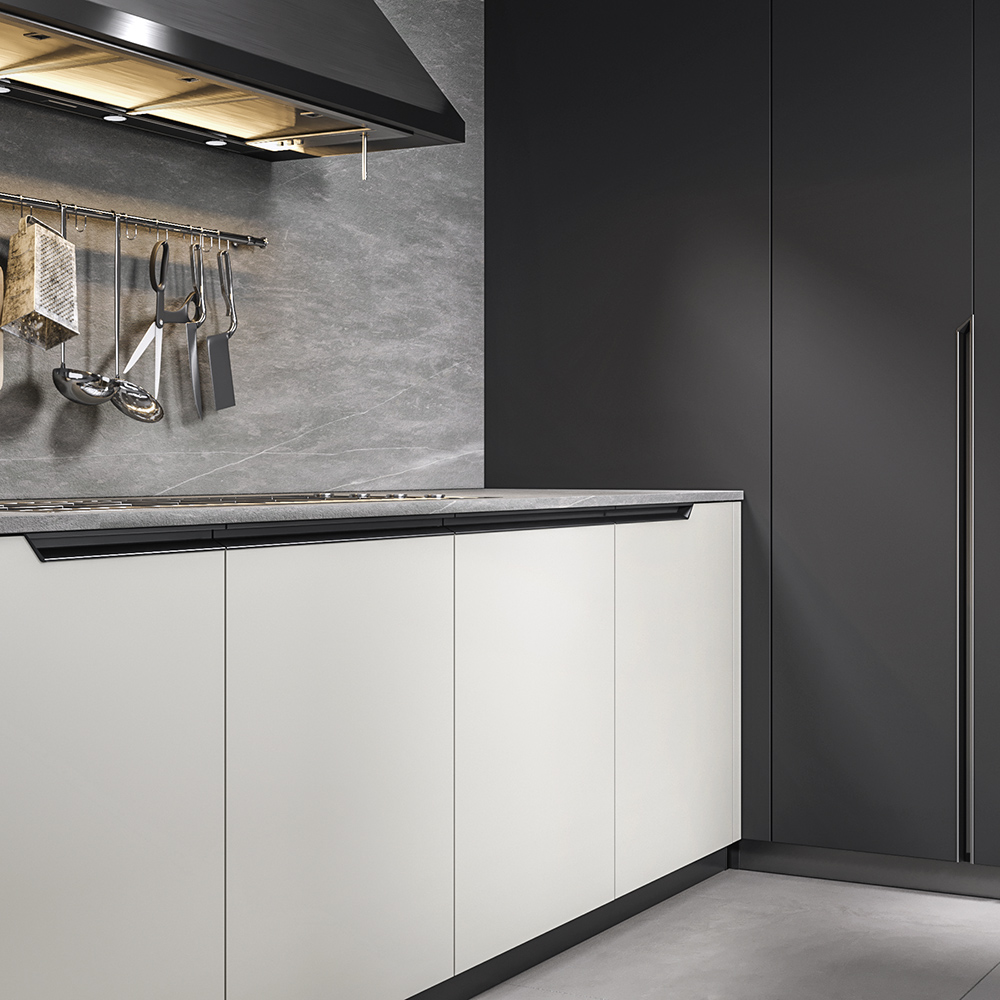 Integrated modular handle FLORIDA-O, LEFT version. Suitable for 22 mm door thickness. 45° cut on the right side and 90° cut on the left side. The elegant grooved detail makes it unique and distinctive. Thanks to the solid bar, it is ideal for creating multiple design solutions in combination with the right version and the Passante model. Available in all metallic finishes. Designed by Marco Bortolin.