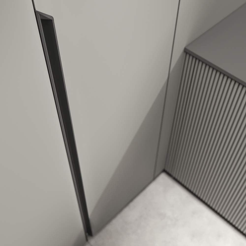 Integrated modular handle FLORIDA-O, RIGHT version. Suitable for 18 mm door thickness. 45° cut on the right side and 90° cut on the left side. The elegant grooved detail makes it unique and distinctive. Thanks to the solid bar, it is ideal for creating multiple design solutions in combination with the left version and the Passante model. Available in all metallic finishes. Designed by Marco Bortolin.
