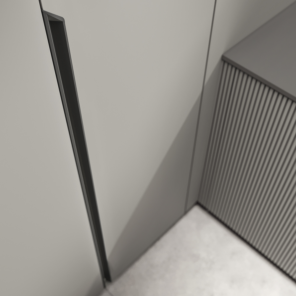 Integrated modular handle FLORIDA-O, LEFT version. Suitable for 18 mm door thickness. 45° cut on the right side and 90° cut on the left side. The elegant grooved detail makes it unique and distinctive. Thanks to the solid bar, it is ideal for creating multiple design solutions in combination with the right version and the Passante model. Available in all metallic finishes. Designed by Marco Bortolin.