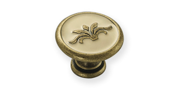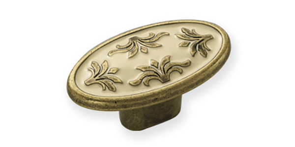 PANDORA knob with champagne enamel, available in oval and round versions, featuring soft lines and floral decorations inside. Design by Marella Design Lab