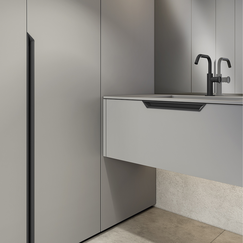 Maniglia integrata modulare FLORIDA. Adatta a spessori anta da 18 mm. Design ricercato con taglio a 45°. Il dettaglio rigato ed elegante la rende unica e diversa nel suo genere. Disponibile in tutte le finiture metallizzate. Design: Marco Bortolin